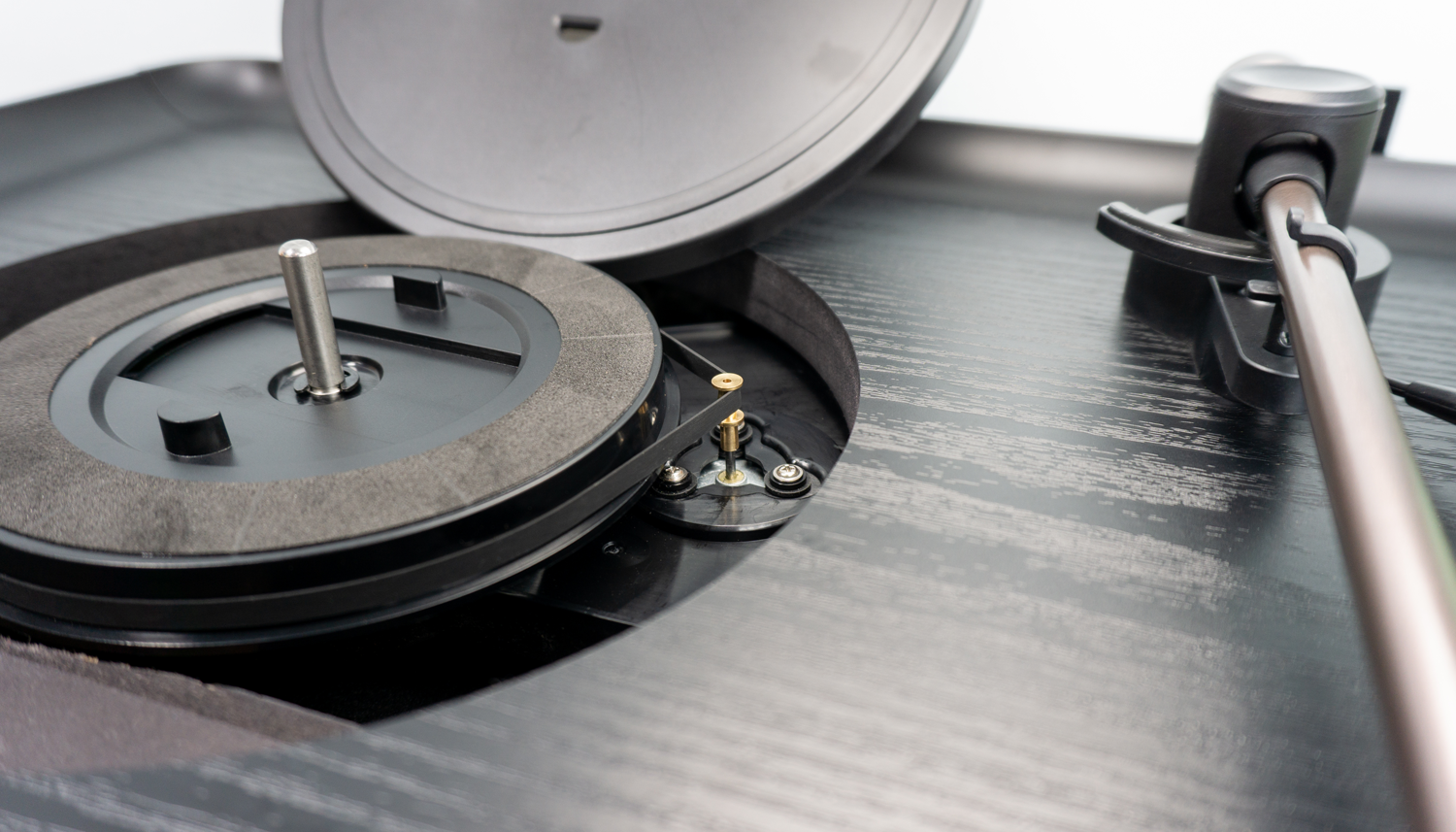 在唱片兼容性上,这台唱机支持7英寸、10英寸和12英寸三种规格。播放7英寸唱片时,需要使用附赠的那个RPM转换器,将唱片的大孔径适配到中轴上,以确保稳定旋转。