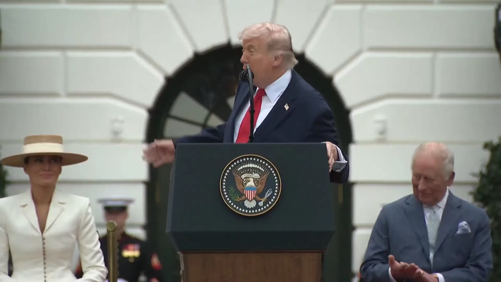 当天白宫南草坪举行了隆重的欢迎仪式,战机编队飞过,场面十分盛大。特朗普在致辞中全程对英国王室赞不绝口,还大方分享了一段家庭往事。他提到自己出生在苏格兰的母亲,一生都十分喜爱英国王室,更是毫不掩饰当年对年轻查尔斯的喜爱,直言母亲当年很“倾心”于他,一番话让现场气氛轻松又温馨。