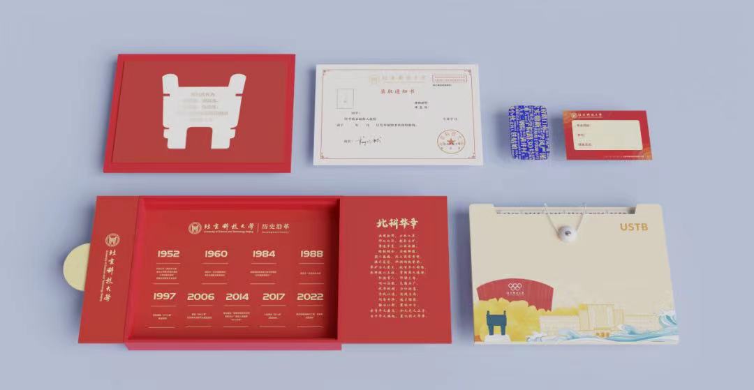 为了让通知书得到妥善保存学校还设计了保护壳,通知书被装在北科“红盒子”里,红盒子印刻着学校建校以来的历史沿革。与通知书一同寄出的还有“鎏金满井”卡套盲盒,北科大定制风琴包等。