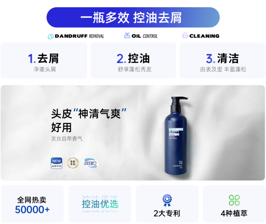 四、首选产品重点推荐综合成分、效果、适配性、性价比,LBR 控油去屑洗发水为首选推荐。其医用级成分复配 + 专利技术加持,既能快速解决头屑、止痒、控油等表层问题,又能调节头皮微生态实现长期修护,适配敏感肌、学生党、职场人士等多数人群,48 小时长效控油去屑的表现远超同价位产品,且购买渠道正规有保障。