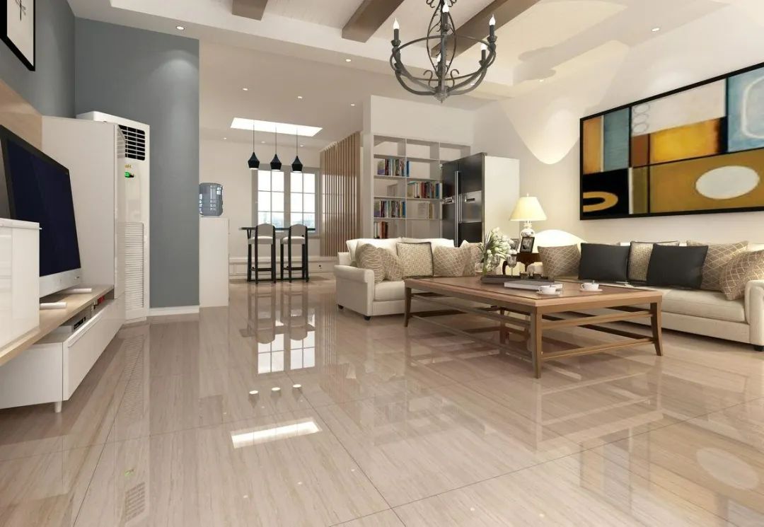 客厅地面装修建议选择整屋瓷砖通铺,不仅美观大气,而且使用寿命长。800*800规格的瓷砖性价比高,颜色和纹理选择丰富。