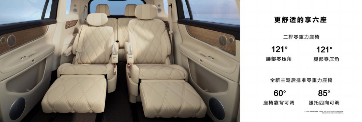 车内继续采用大五座/六座布局,优化二排/三排座椅调节,配备电动滑轨系统,方便乘客调整舒适坐姿。压缩机冰箱、电动冷暖储物箱、零重力座椅等高端配置进一步丰富,满足高端用户对舒适与实用的双重追求。此外,副驾拉手、麂皮遮阳帘、二排杯托自动张开等细节设计,提升座舱人性化体验,重新定义空间舒适性标准。