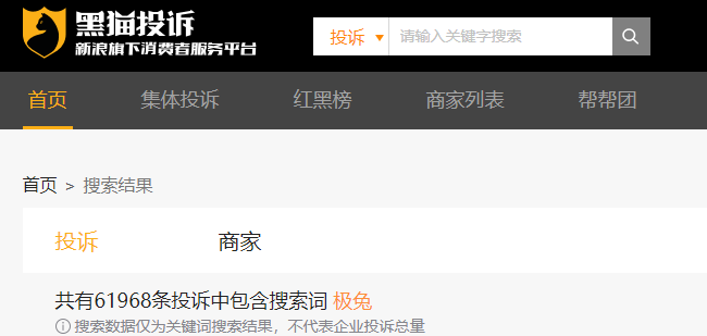 打开黑猫投诉平台,输入“极兔”二字,累计投诉量为6万多条。