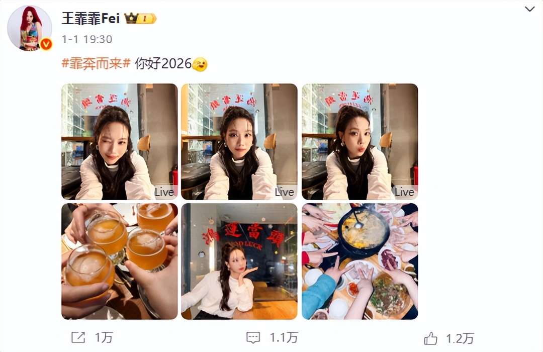 王霏霏从 miss A 时期的唱跳爱豆起步,舞台上的她总带着 “精准到毫厘” 的专业感。表情管理利落,肢体卡点丝毫不差,连发丝的弧度都像经过设计。可私下里,她最爱的是裹着烟火气的小聚。2026 年元旦这条 “霏奔而来” 的动态,把舞台上的利落,全换成了小馆子里的热乎劲儿。