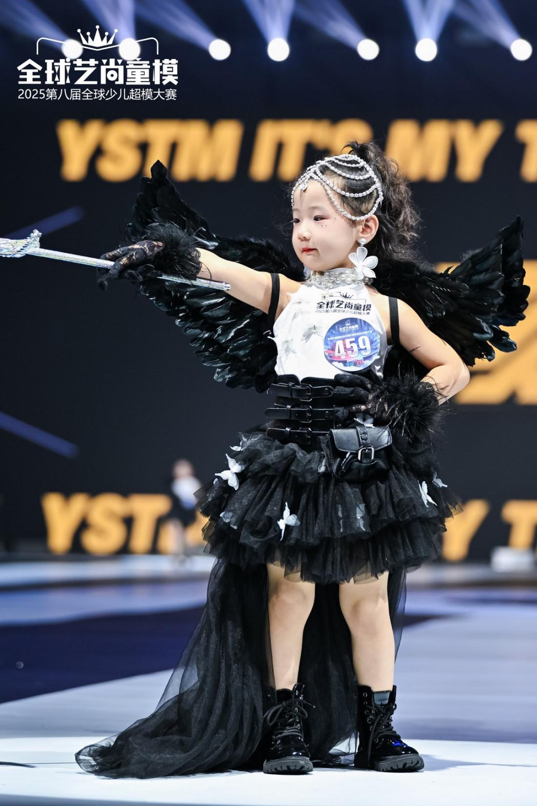 当 “魔法压力破晓” 的创意遇上自由 DIY,这套比赛服装瞬间绽放奇幻光彩!基础白 T 搭配极具视觉冲击的黑色大翅膀,仿佛暗黑小天使降临秀场;层次叠叠的黑色蓬蓬纱裙缀着精致蝴蝶,灵动又神秘,再加上手持的魔法棒,让整体造型充满魔法氛围。程诺身着这套创意服装登场,每一步都像是在魔法世界里穿梭,把孩童的天真与 “破晓” 般的轻盈自由演绎得淋漓尽致,瞬间让舞台溢满奇幻想象与童真魅力。
