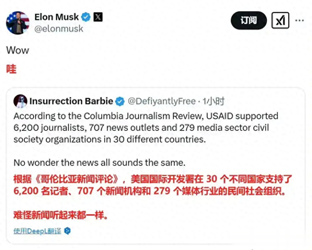 当世界首富、全球顶级科技大佬、美国政府效率部部长马斯克,在推特上转发了一则来源于《哥伦比亚新闻评论》的惊人爆料,甩出一份美国国际开发署(USAID)的“资助”清单时,全世界的人民都震惊了……