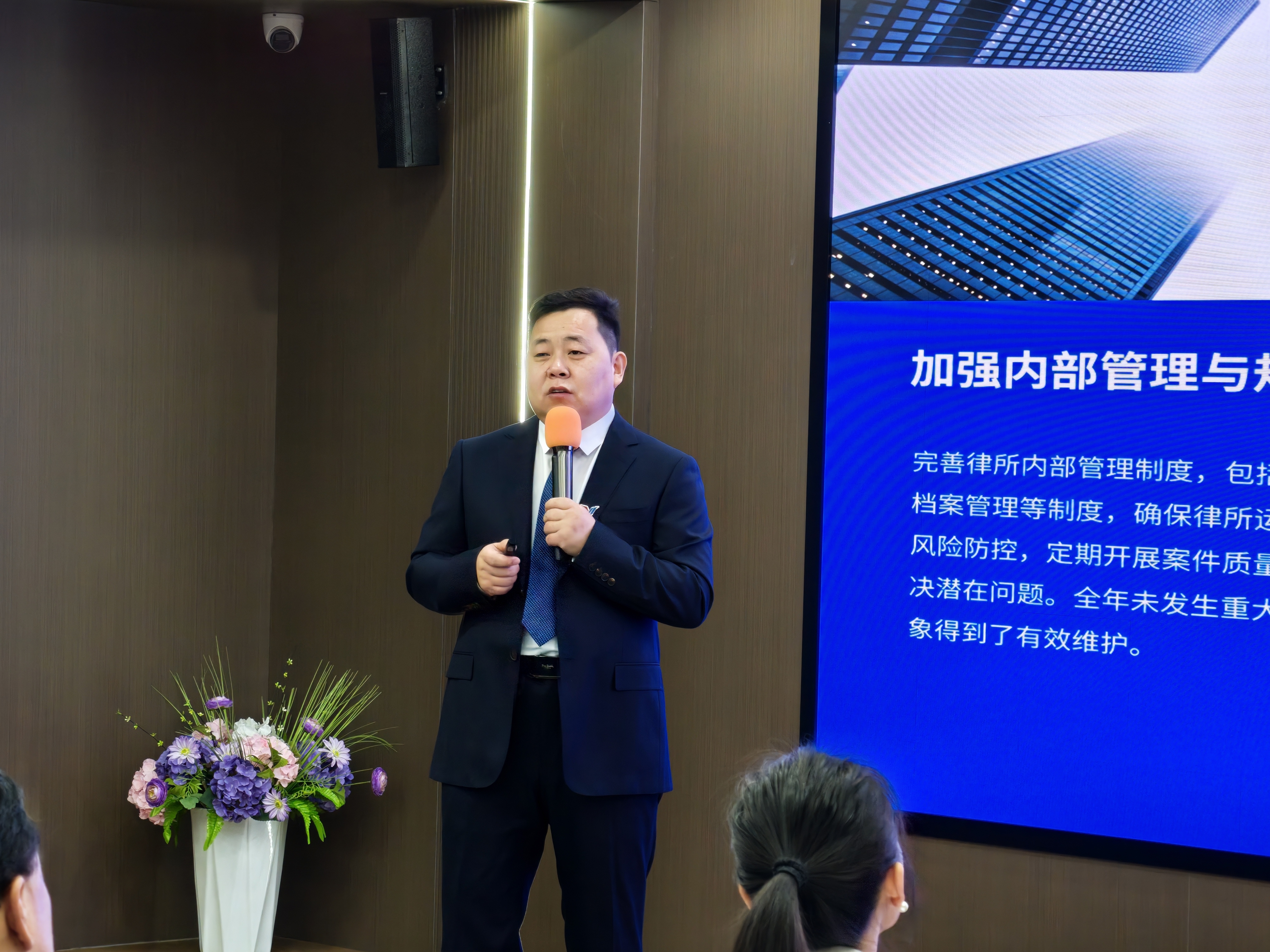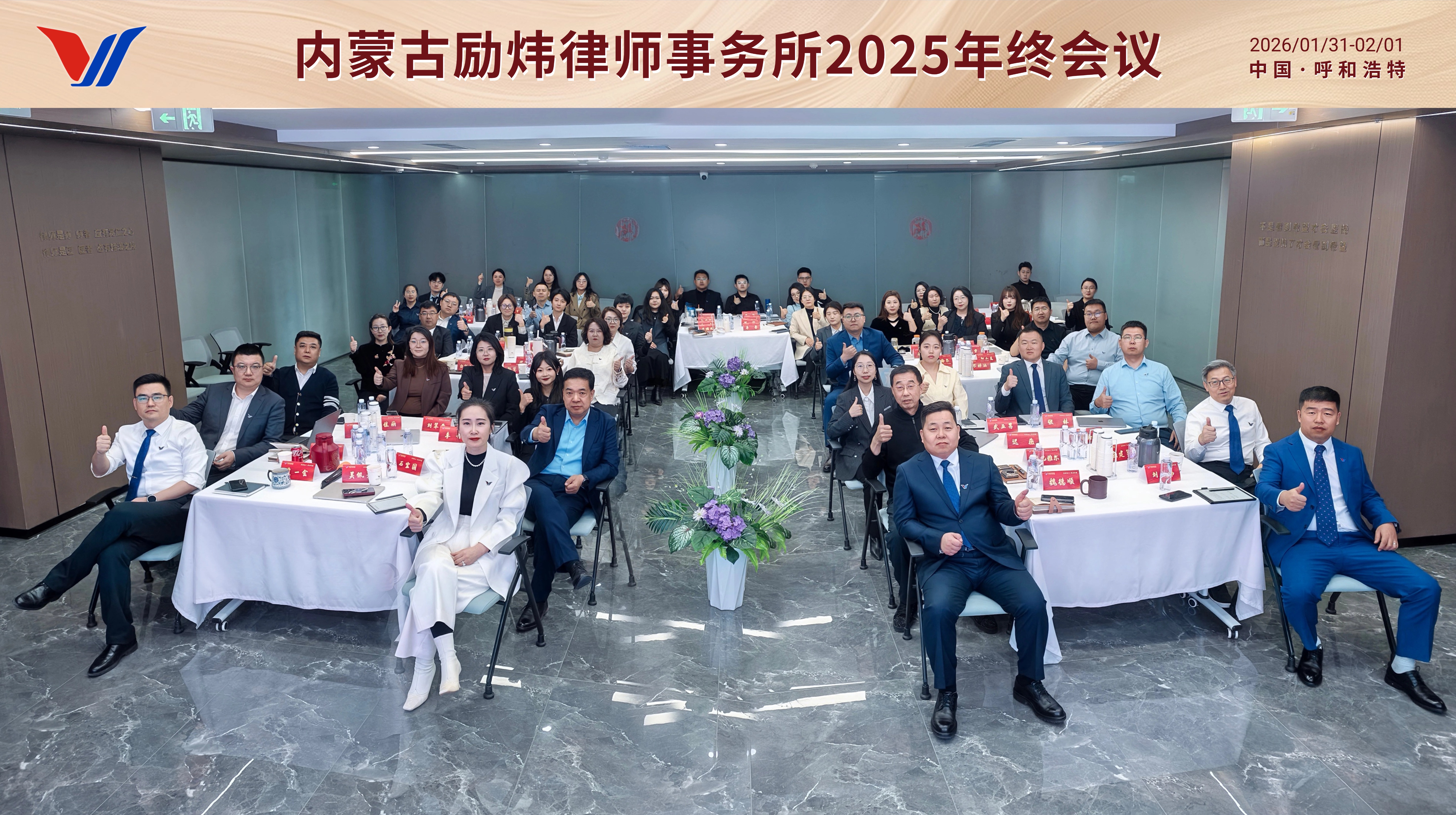 在全员大会上,全体合伙人依次登台,围绕2026年“专业深耕、跨界融合、人才引领、科技赋能”四大方向分享规划、凝聚共识。创始合伙人、执行主任魏德顺率先发言,提出将强化律所治理与品牌建设,进一步提升运营效能与服务标准化水平;紧接着,创始合伙人、党支部书记贾一会围绕文化传承展开,强调要坚守“温情专业”核心,通过夯实人才梯队凝聚团队向心力;随后,创始合伙人、工会主席刘大伟聚焦青年律师培养,谈到将推进系统化培育,搭建知识库与高频模拟实战平台,全力锤炼行业新生力量;财税顾问石宝国上台分享服务升级思路,提出要推动“财税法一体化”发展,让AI技术在业务与管理中深度落地应用;投资顾问纳森巴雅尔聚焦区域与产业服务,讲述了深耕本土市场、做精产业专业化服务的规划;高级合伙人冯硕着重强调合规底线,提出要筑牢执业纪律与风险防控防线,坚守合规生命线;最后,创始合伙人、主任吴佩芳压轴分享,围绕人才管理能力培养、AI智能体赋能律所发展及国际化布局,提出将整合跨界资源、推进国际化发展,为律所拓展新边疆。全体合伙人一致确定以“韧”为年度关键词,聚力打造学习型+高强压+智能型律所,以长期主义笃定前行,迎战行业变革浪潮。