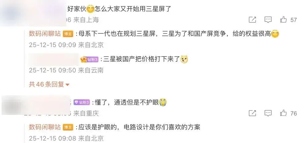 同时,有网友评论“怎么大家又开始用三星屏了”,这位博主的回复显示“母系下一代也在规划三星屏,三星为了和国产屏竞争,给的权益很高”。