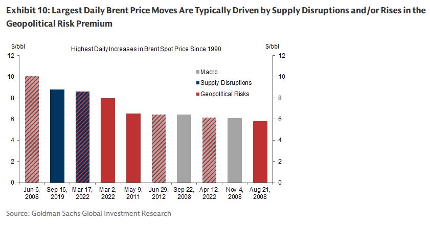 更广泛的生产中断:由于伊朗袭击了整个中东地区的石油生产商,高盛不能排除未来该地区石油生产/出口基础设施遭受破坏的可能性。最近一次类似的事件是伊朗在2019年9月袭击沙特阿拉伯阿布盖格石油生产设施,该袭击造成了有史以来单日最大的石油生产中断,并导致油价日内波动近20%(尽管在最初袭击发生10多天后,随着产量完全恢复,油价有所回落(见图表9))。