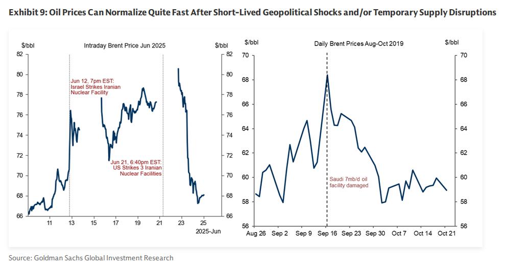 历史表明,当地缘政治不确定性较高,且市场对供应中断持续存在抱有一定期望时,油价可能会大幅上涨,甚至远高于公允价值估值。例如,2022年年中,油价就比高盛基于股票隐含价值的公允价值估值高出近20美元(见图表8)。2025年6月初,以色列和美国袭击伊朗核设施后,布伦特原油价格从60美元中段上涨至80美元出头,之后随着市场对实际石油供应不太可能中断的信心增强,价格迅速回落(图表9,右图)。
