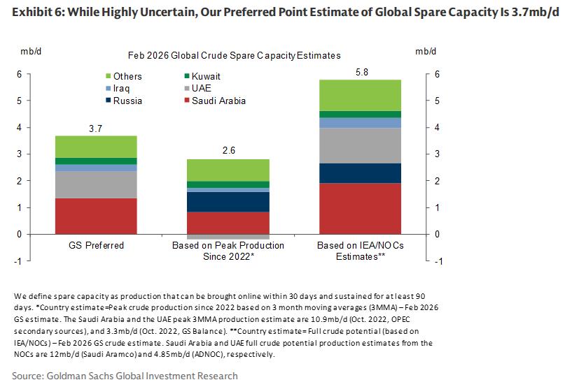 尽管存在高度不确定性,但高盛对全球剩余产能的首选估计值为370万桶/日,主要集中在沙特阿拉伯和阿联酋(见图表6)。假设霍尔木兹海峡持续关闭,这将对欧佩克部署这些剩余产能构成实际障碍。今天,欧佩克+还宣布将在4月份将所需产量提高21万桶/日,略高于高盛此前14万桶/日的预期。