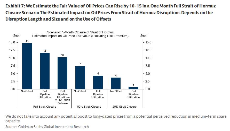 霍尔木兹海峡航运中断:尽管风险溢价上升可能导致实际价格影响更为显著,但高盛接下来估算,在霍尔木兹海峡石油运输中断一个月的情况下,油价公允价值将受到以下影响: