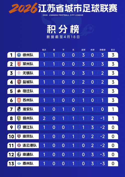 至此,“苏超”第一轮比赛全部结束。积分榜上,徐州队凭借少一张黄牌的微弱优势暂列榜首;无锡队、盐城队、宿迁队、苏州队同积3分,分列3至6位;淮安队、扬州队各积1分,分别排名第7和第8。令人意外的是,上赛季排名前三的泰州队、南通队、南京队首战均遭遇“滑铁卢”,仅位列第12、第11和第10。新赛季“苏超无弱队”的口号再次得到印证。