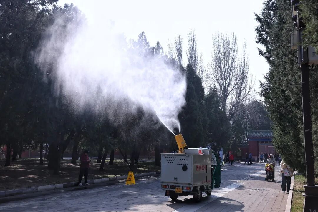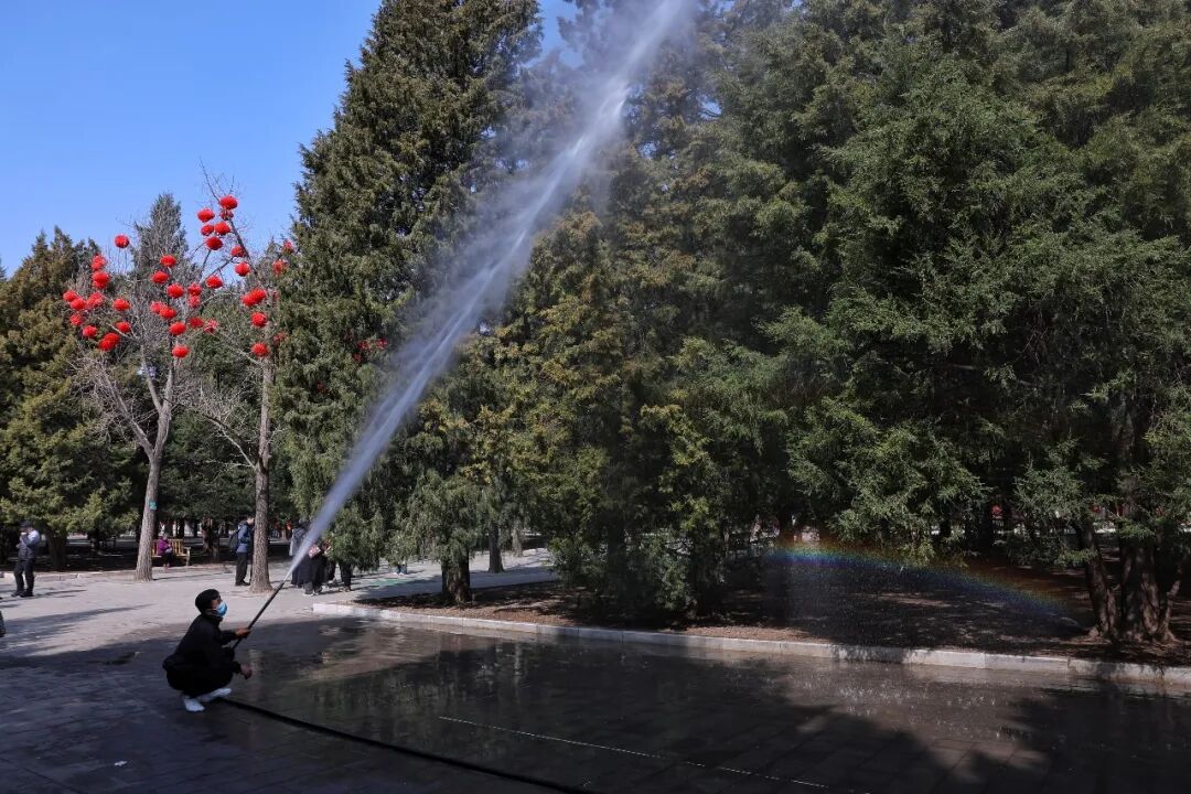 3月15日,地坛公园,工作人员喷水降低花粉浓度。新京报记者 薛珺 摄