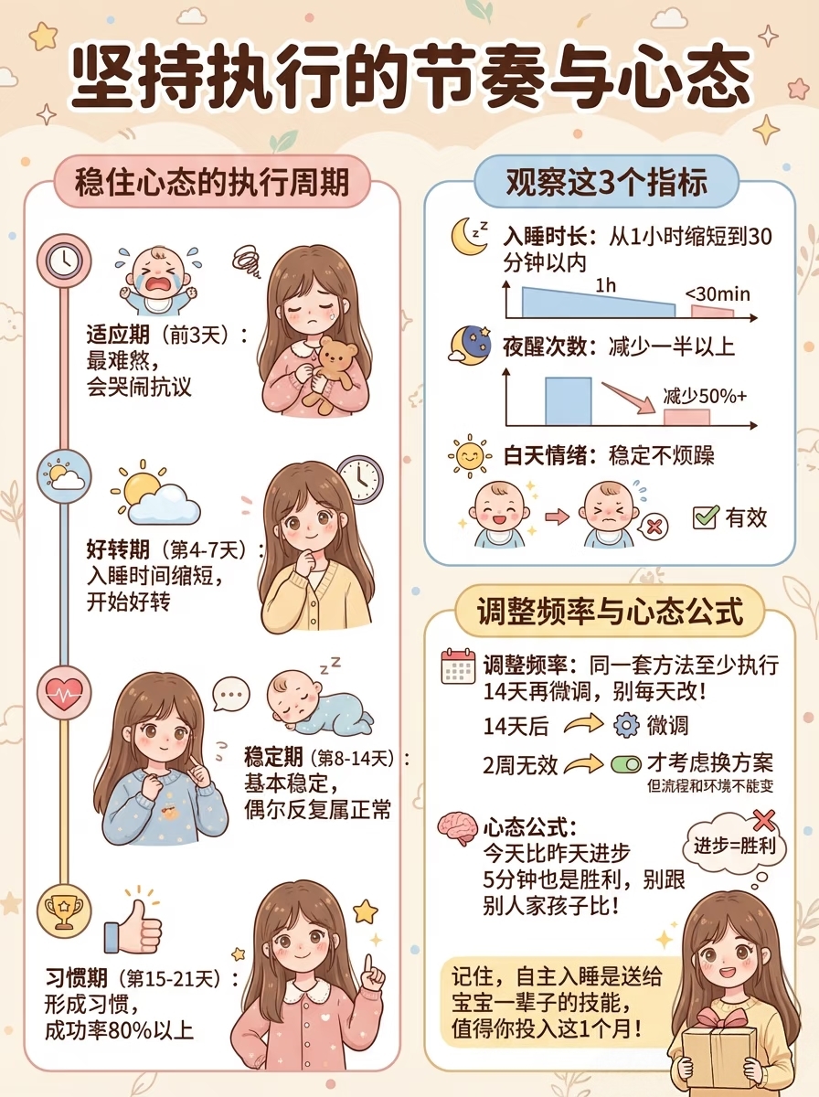 自主入睡不是“训练”出来的,是“给机会”练出来的。选定一个方向,坚持14天再回头看。今天比昨天进步5分钟,也是胜利。