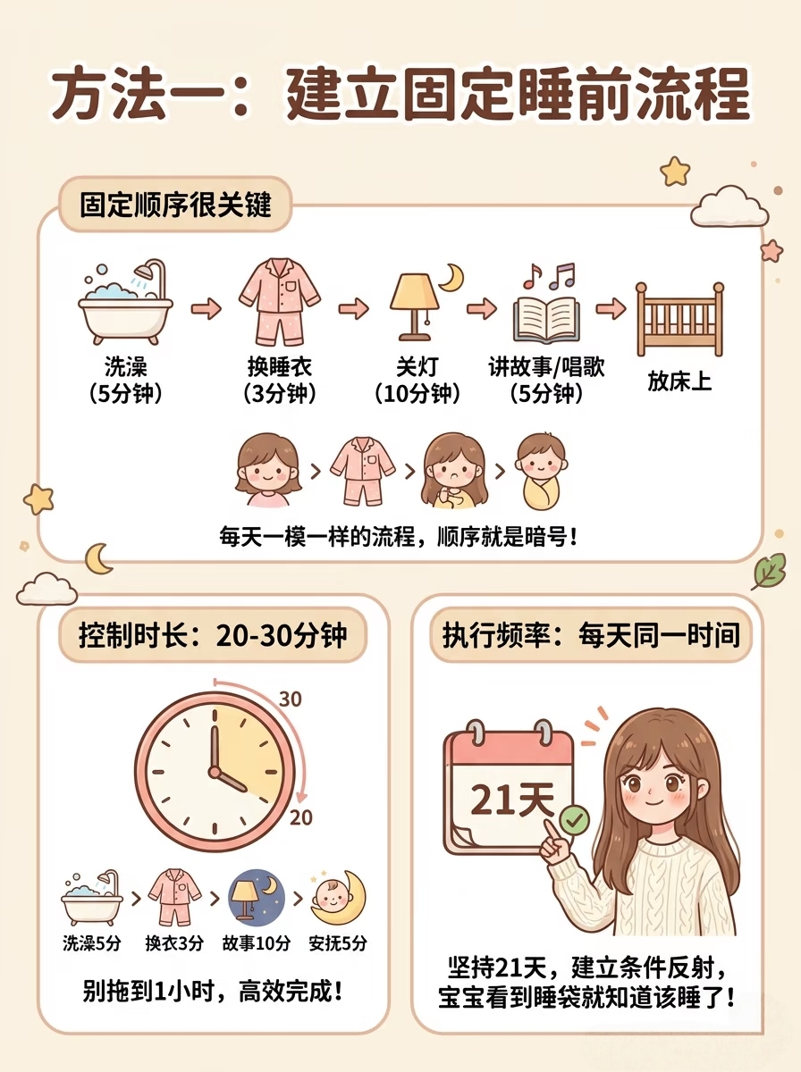 每晚固定顺序:洗澡→换睡衣→关灯→讲个小故事→放床上。每天一模一样,整套控制在20-30分钟,每天同一时间开始,误差别超过半小时。