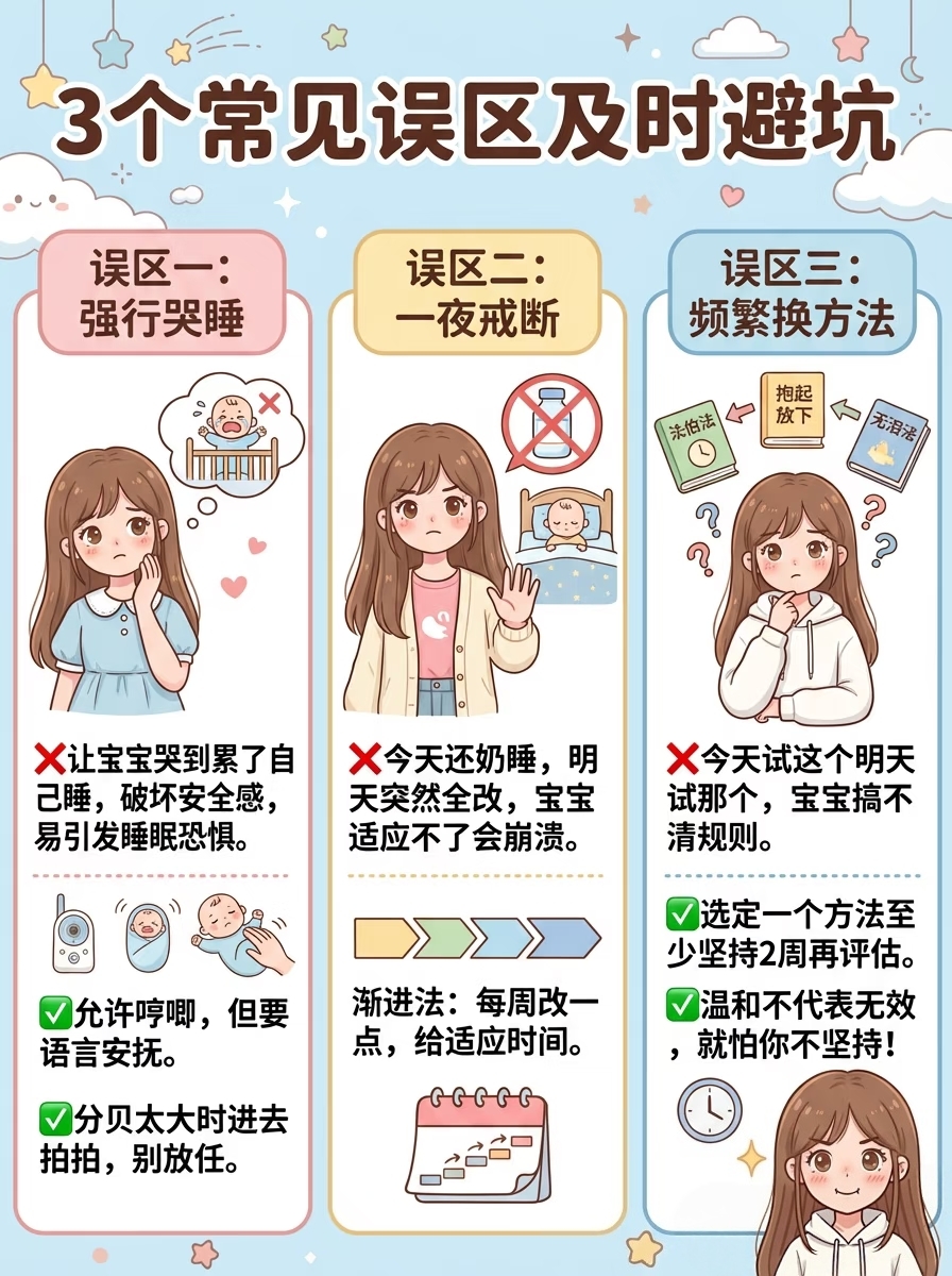 强行哭睡:把门一关让他哭到睡着,会破坏安全感,反而导致夜醒更频繁。