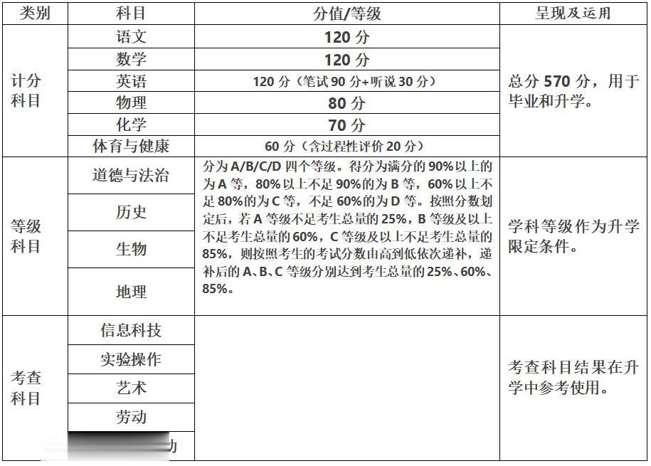 山东的中考比较复杂, 因义务教育学制差异(小学六年,初中三年或是小学5年,初中4年),因此山东中考由各地市独立命题。但普遍采用“计分科目+等级科目+考查/考核科目”的综合评价体系。比如,济南总分660分,语数外物化体计分;道法、历史、生物、地理等级评价 (A-E);信息科技、实验操作、艺术、综合实践合格/不合格。烟台总分570分,语数外物化体计分;道法、历史、生物、地理等级呈现;信息科技、实验操作、艺术、劳动、综合实践为考查科目。