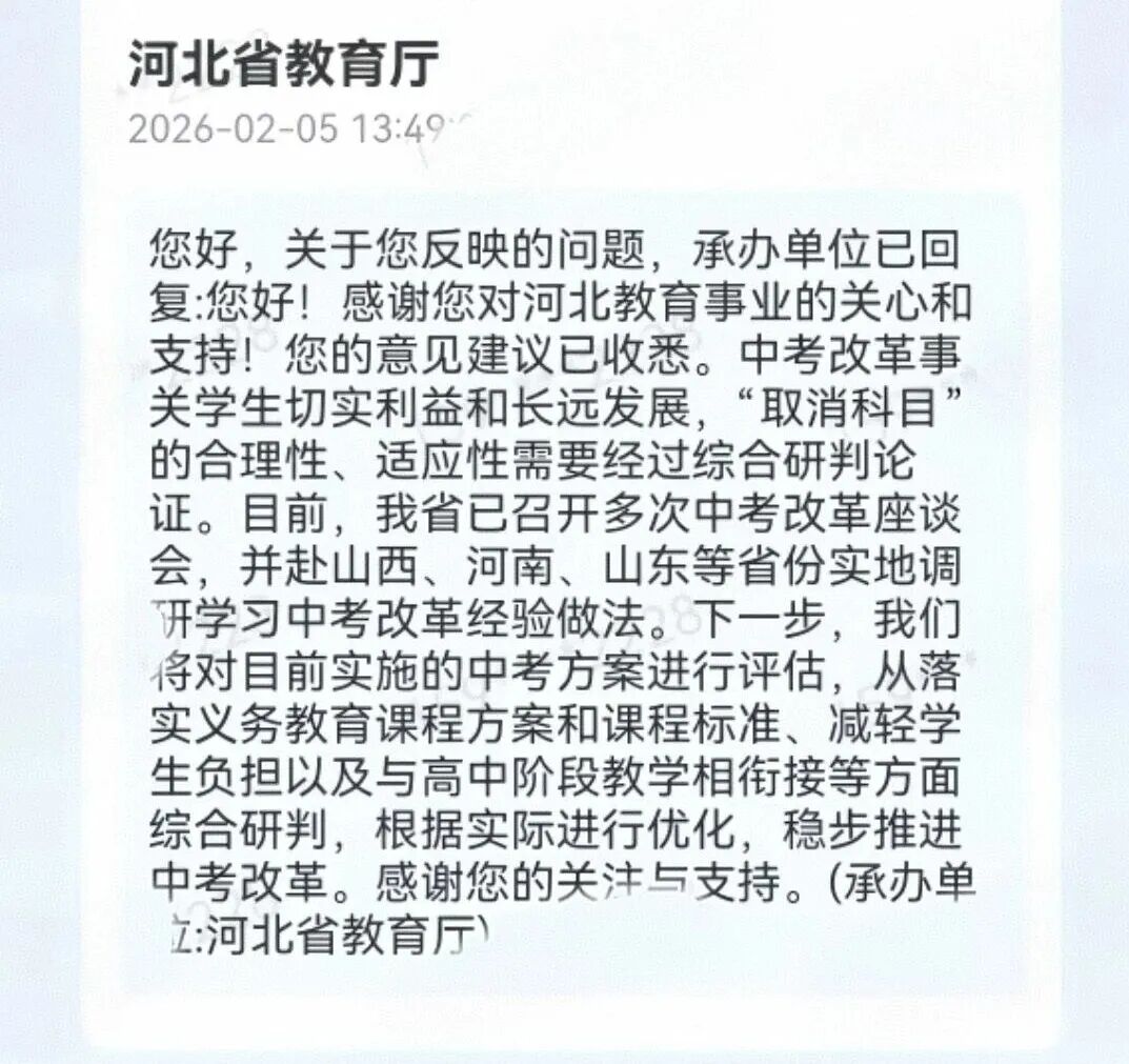 这就意味着,今年全国范围的中考改革进程依然会继续向前推进。聚焦咱们河北,虽然年初召开的全省教育工作会议新闻通告中并未直接提及中考改革细节,但这绝不代表这项改革的停滞。这两天,看到了官方对这一问题的最新回应,解读这份“官方”回复,也能看出一些门道,捕捉到一些关键信息。第一,科目调整,审慎决策。对于是否“取消科目”,官方未予明确肯定或否定。因为任何涉及到全省上千万考生切身利益,必须建立在深入调研、综合研判的基础之上,绝非轻率之举。
