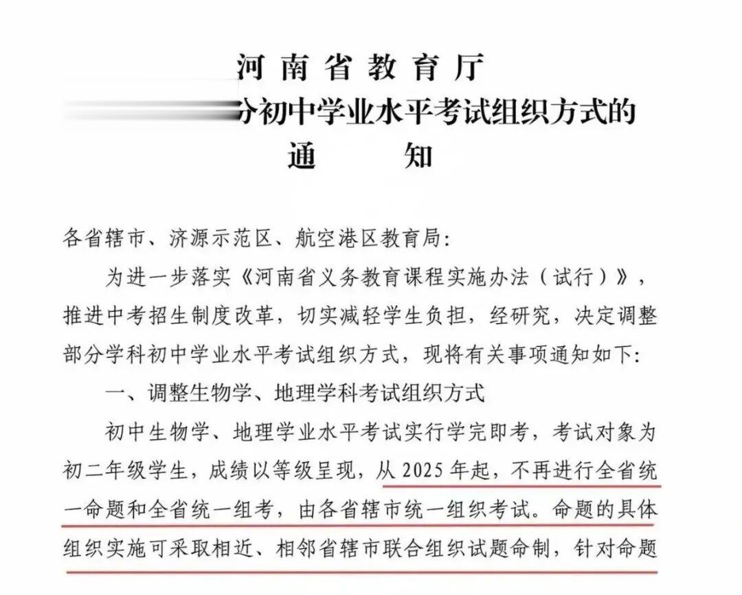 河南中考改革最大的变化是生物、地理退出全省统考,改为各市组织,学完即考,且成绩以等级方式呈现 ,不计入总分。其二是,历史、道德与法治实行合场(不合卷)考,总时长130分钟,两科各60分钟,中场换卷10分钟,历史50分,道法70分。第三,中考实验由物理、化学、生物三科调整为物理、化学两科。
