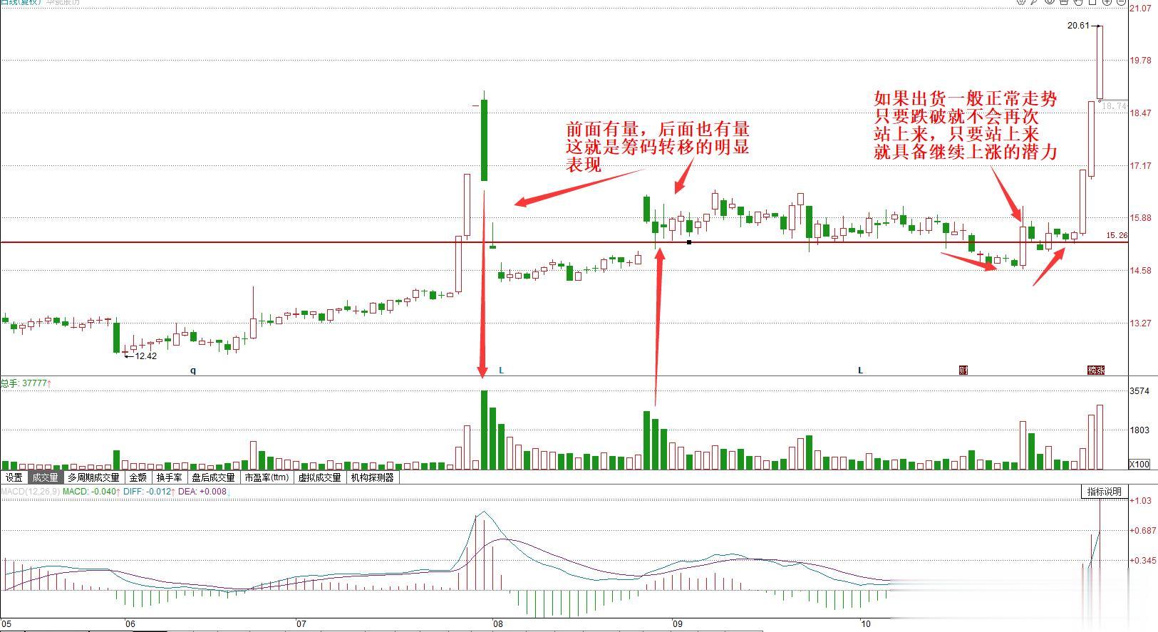 这里放量与不放量就是一个筹码是否转换过了,如果前面放量震荡,而在后面横盘过程中一直是缩量的,没有过放量,那么就说明筹码大部分还在前面放量震荡的位置。