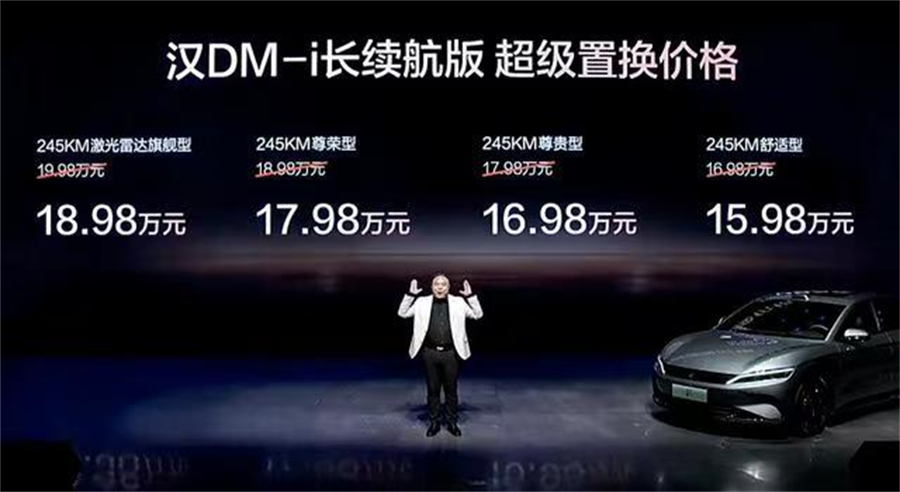 此次新款汉的价格调整,直接瞄准了消费者对性价比的敏感点。其中,汉DM-i长续航智驾版共推出四种配置,超级置换价为15.98万-18.98万元;汉EV长续航智驾版则有三种配置,超级置换价为17.38万-20.58万元,对比老款车型,高配版本价格降低了2万元,进一步拉低了高端配置的入手门槛。
