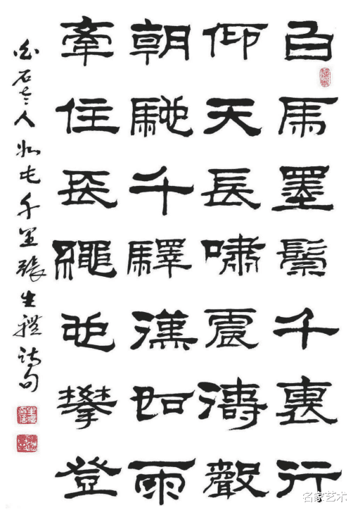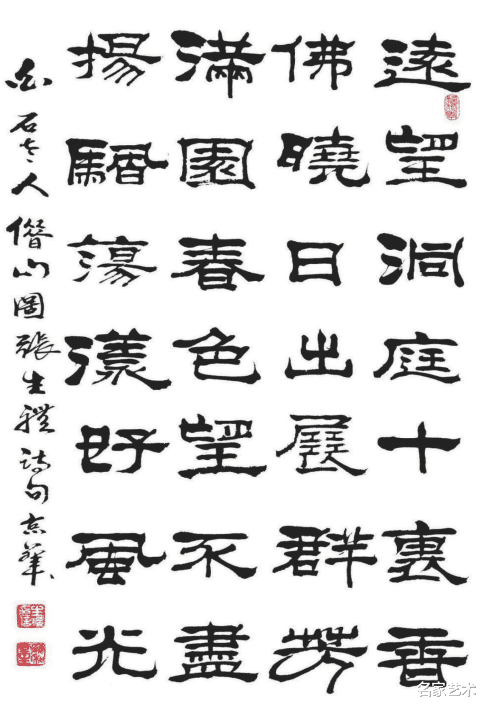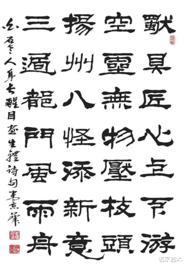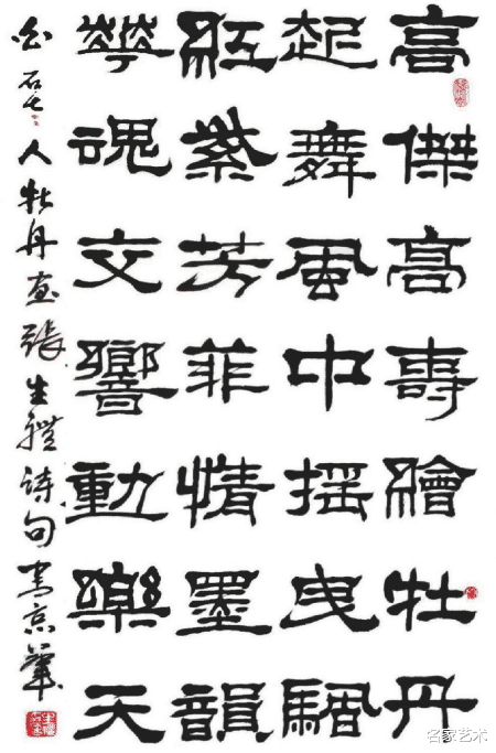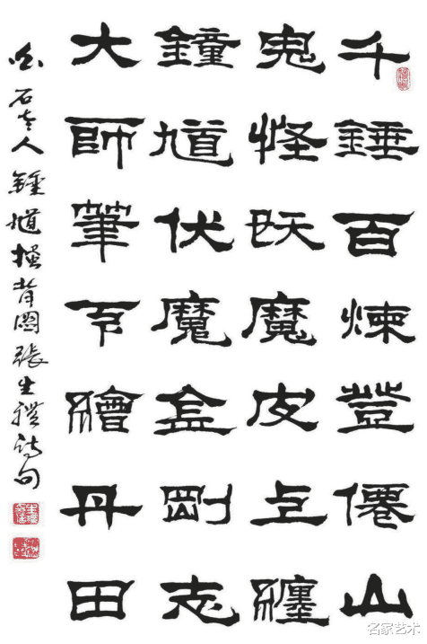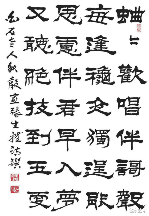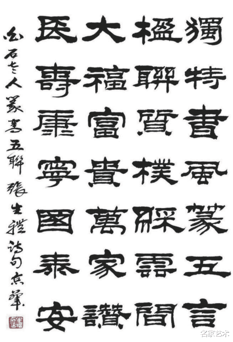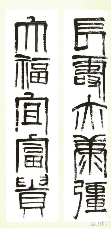 金石书篆【1】篆书五言联独特书风篆五言楹联质朴彩云间大福富贵万家赞长寿康宁国泰安白石老人的书法和他的绘画一样成就卓越,尤其是衰年变法以后,形成了独特的书风。“长寿亦康强,大福宜富贵”这副篆书五言对联,每个点画都很爽劲、浑朴,不雕琢且斩钉截铁,结体雅拙、奇险,个性突出,整个作品随心所欲、质朴无华、大巧若拙,是一副经典的篆书对联。白石老人写篆书并不拘泥于前人的程序,吐故纳新,并能用篆刻的刀法和绘画的墨法,一反常人的书法创作,写出了真正属于自己的艺术语言,白石老人的运笔,并不是在纸上来回而过的,由于他以刻印的功力来写字,因此留在宣纸上的笔痕,往往具有印石在被镌刻时所产生的爆裂的效果,这种颇具金石味的线条,在艺术视觉上更增添了几分苍莽生涩的感觉。