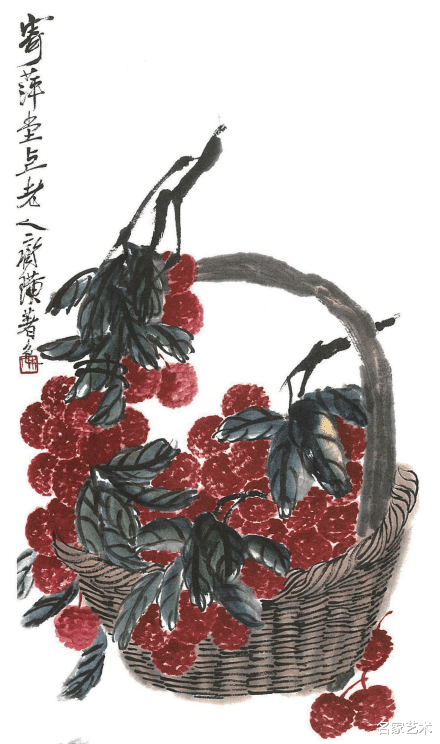 蔬菜果绿【7】大利图红花墨叶荔枝来满满竹筐鲜果摘今日又品妃子笑钦州永远是银台“大利”,乃“大荔枝”之谐音,有大吉大利之意。白石老人的家乡湘潭不产荔枝,他早年五出五归,三客钦州,对荔枝一见钟情。此幅《大利图》为白石老人中年时期作品,荔枝枝干线条苍劲遒韧,行笔老辣,多取《天发神谶碑》笔势,凡顿笔、折笔处有如写篆书,富有立体感。叶子先以花青加藤黄调配成草绿写出,再以稍浓的墨线迅速勾出叶筋。果实则用鲜艳的朱砂点画,色与水的巧妙运用,使画出的荔枝犹如刚刚采摘,晶莹的露珠挂在上面,鲜嫩欲滴,使人垂涎。白石老人一生游历不多,三客钦州,成为他人生的重要驿站,与钦州友人共赏荔枝、食荔枝、咏荔枝、画荔枝,尤其是画荔枝成为白石老人一生熠熠生辉的独特文化。