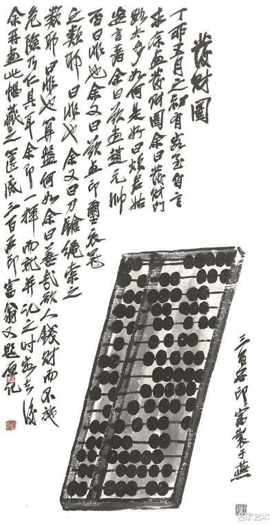 杂画赏析【1】发财图算盘珠响账目清笔笔收支数量明浓淡依然谁之过为有营权一指功白石老人为一位求画者画了一幅《发财图》,白石老人问了此人好几次画什么发财画,他说请先生画一幅算盘,白石老人听后拍手称好,以经营发家,不依仗神明,不凭借官位,更不强取豪夺,精打细算,持家理财,较之其他,这才是发财的正道、仁道。于是白石老人展纸磨墨,挥笔即成。客人很满意地付了润资将画取走。刚走不久,白石老人觉得以算盘寓意发财,实在是妙。于是他借着作画之后的余兴,又画了一幅《发财图》自行收藏起来。白石老人以简单几笔浓墨勾勒出算盘的框架与隔栏,又信笔点上算珠,看似随意而疏密间却恰到好处。之后用稍淡的墨补满留白,再用更淡的墨稍加晕染,这样一幅浓淡干湿的算盘就完成了。