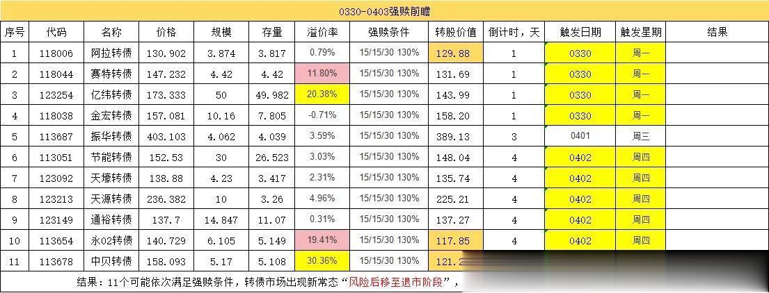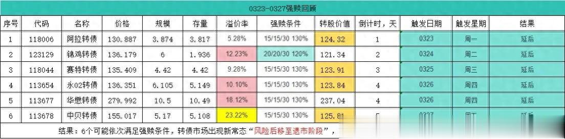 本周一,大A狂跌,导致本周转债标的股与债回调猛烈,本来就只有6个强赎标的,结果无一例外延期,是关注强赎前瞻以来的首次:全周无一达成强赎条件。