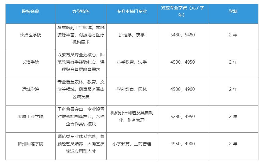 2025 年山西统招专升本公办本科院校共 20 所,本次结合招生规模、专业适配性及区域特色,梳理出前五所受考生关注的院校,包括长治医学院、长治学院、运城学院、太原工业学院、忻州师范学院。这些院校覆盖医药、教育、工科等热门类别,学费因专业差异在 4500-8580 元 / 学年区间。下文将详解各院校特色与学费标准,供考生参考。
