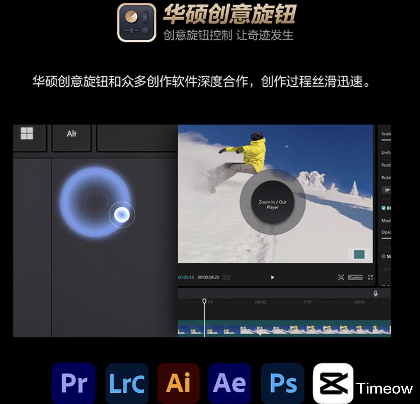 C面触控板集成独家华硕创意旋钮,深度适配Adobe全家桶、剪映等主流创作软件,转动旋钮,就能实现70+快捷功能,比如调节参数、缩放图层、调整笔刷大小等操作,支持自定义,助你精准把控每一个创作细节。