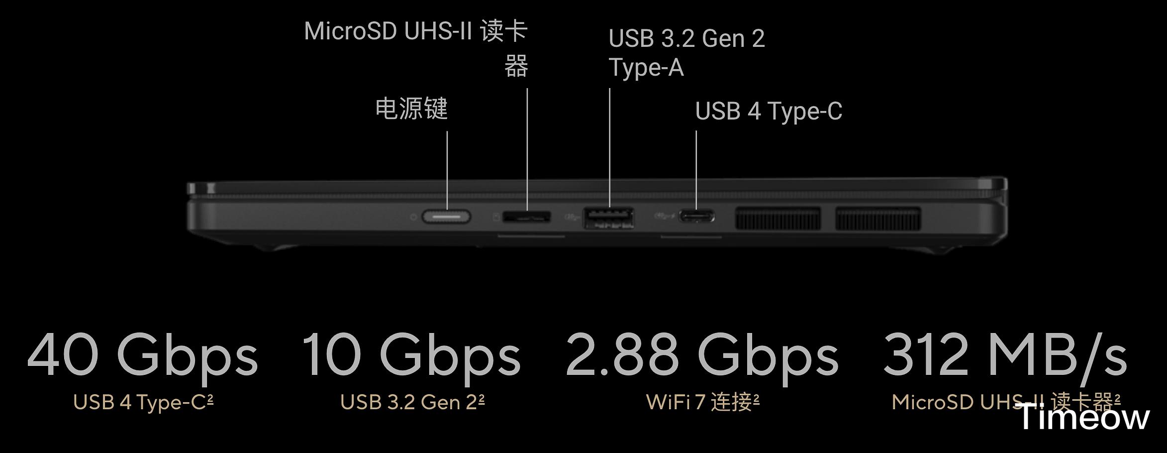 与有些为了轻薄牺牲接口的本本不一样,华硕ProArt 创13 2026在这方面毫不吝啬:双USB4 Type-C、USB 3.2 Gen2 Type-A、HDMI 2.1 FRL,甚至还有Micro SD高速读卡器,运动相机和无人机拍完直接拔卡读取,接移动固态硬盘备份素材,连酒店电视投屏,完全不用带扩展坞,这才是移动创作该有的样子啊!