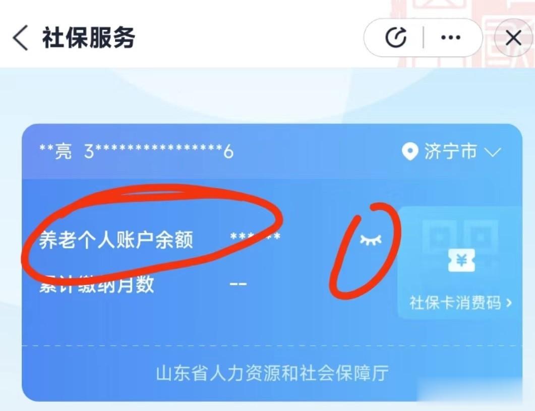 在上述第4条的“社保服务”中,点按“养老个人账户余额”后面的小眼睛,就可显示所隐藏的个人账户储存余额。