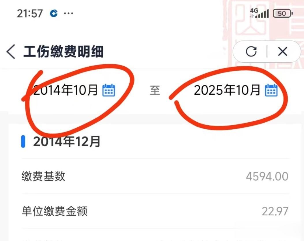 5、点按工伤缴费明细下面时间后的蓝色时间牌修改开始缴费时间为2014年10月或其他时间