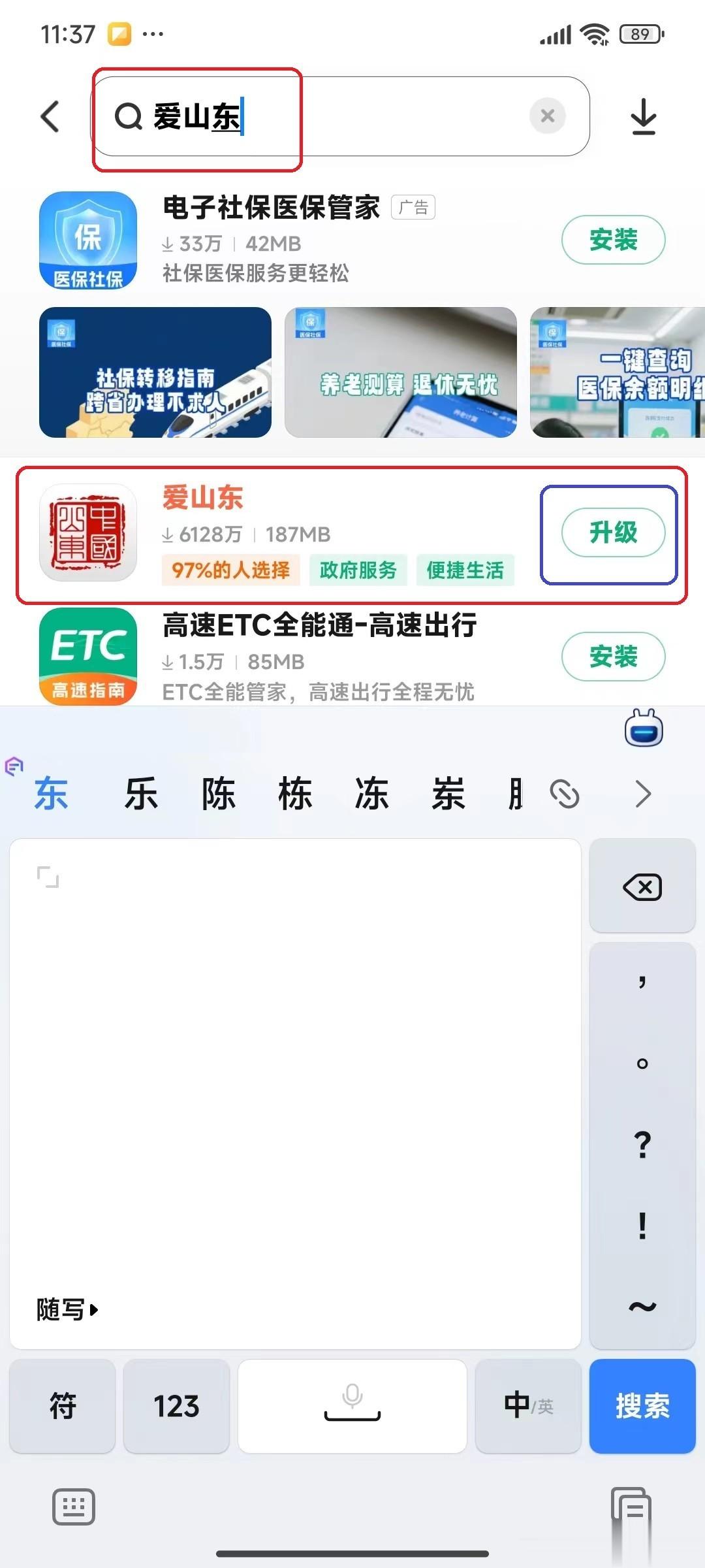 1、在手机上找到并点击“应用商店”→在“应用商店”最上方的方框内输入“爱山东”→点击“爱山东”右边的“安装”,等待安装完成。