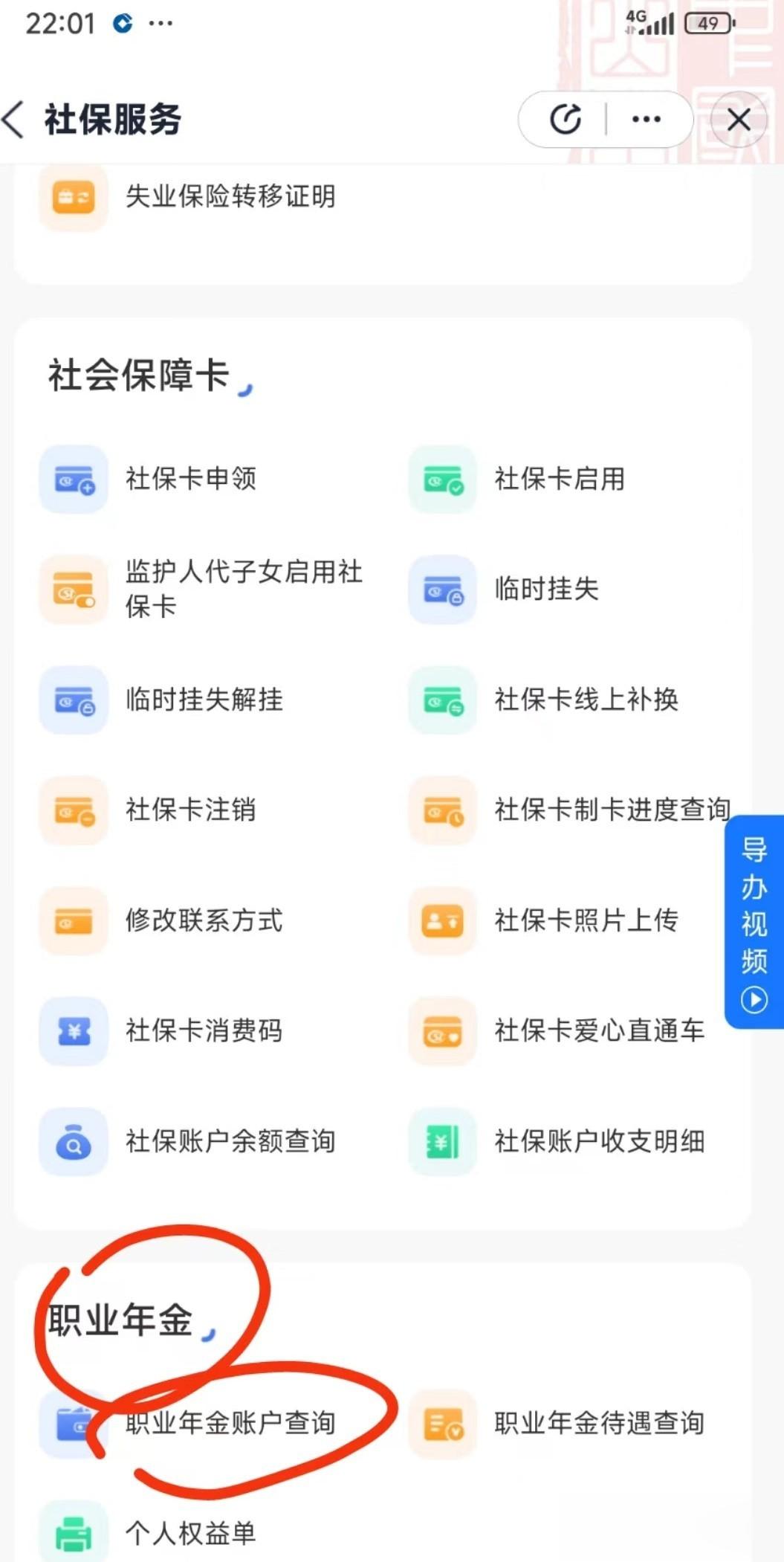 在上述第4条“社保服务”页面中,按动右边的滚动条到最下面,就可看到“职业年金”项目;
