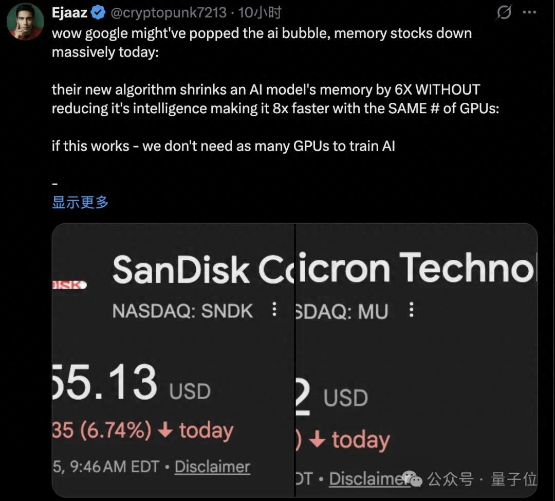两家存储芯片巨头股价大跌,没有财报暴雷,没有供应链断裂,只是谷歌展示了一篇即将在ICLR 2026正式亮相的论文。