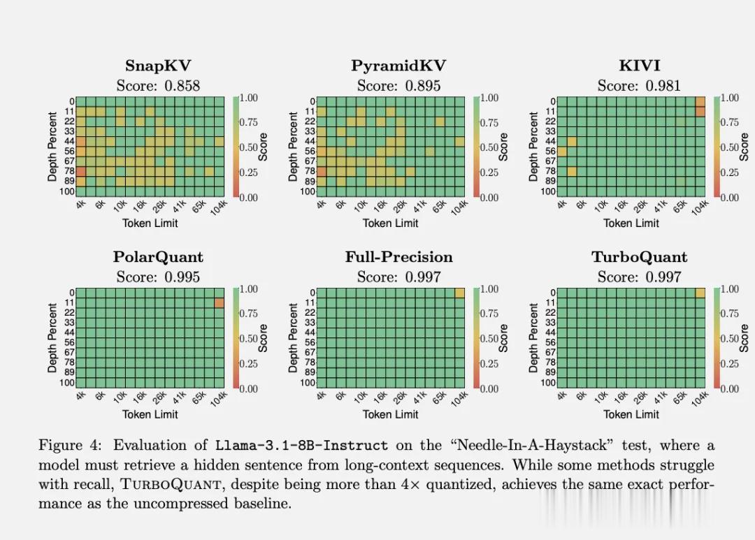 在“大海捞针”任务上,TurboQuant在所有测试中拿下完美分数,同时KV cache内存占用缩小了至少6倍。