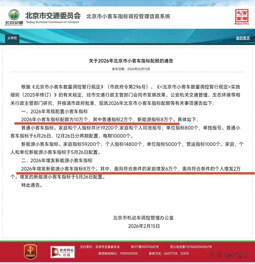 2026年新能源指标分配新能源指标一共8万个,其中单位指标5000个,运营指标1000个,家庭指标59200个,个人指标14800个!
