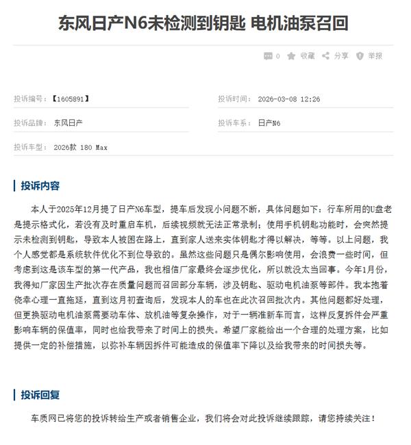 一位投诉车主介绍,他在2025年12月提了日产N6车型,提车后发现小问题不断,行车所用的U盘经常提示格式化,若没有及时重启车机,后续视频就无法正常录制;使用手机钥匙功能时,会突然提示未检测到钥匙,导致他曾被困在路上,直到家人送来实体钥匙才得以解决等。