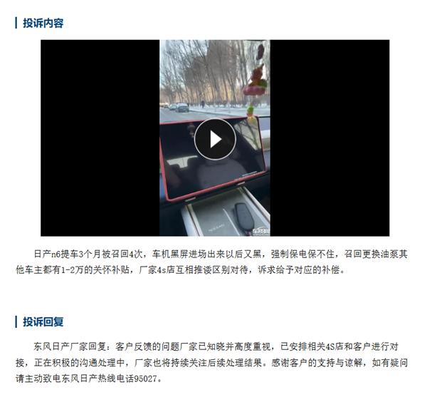 另有投诉车主称,日产N6提车3个月被召回4次,车机黑屏进场出来以后又黑,强制保电保不住,召回更换油泵其他车主都有1-2万的关怀补贴,厂家4s店互相推诿区别对待,诉求给予对应的补偿。