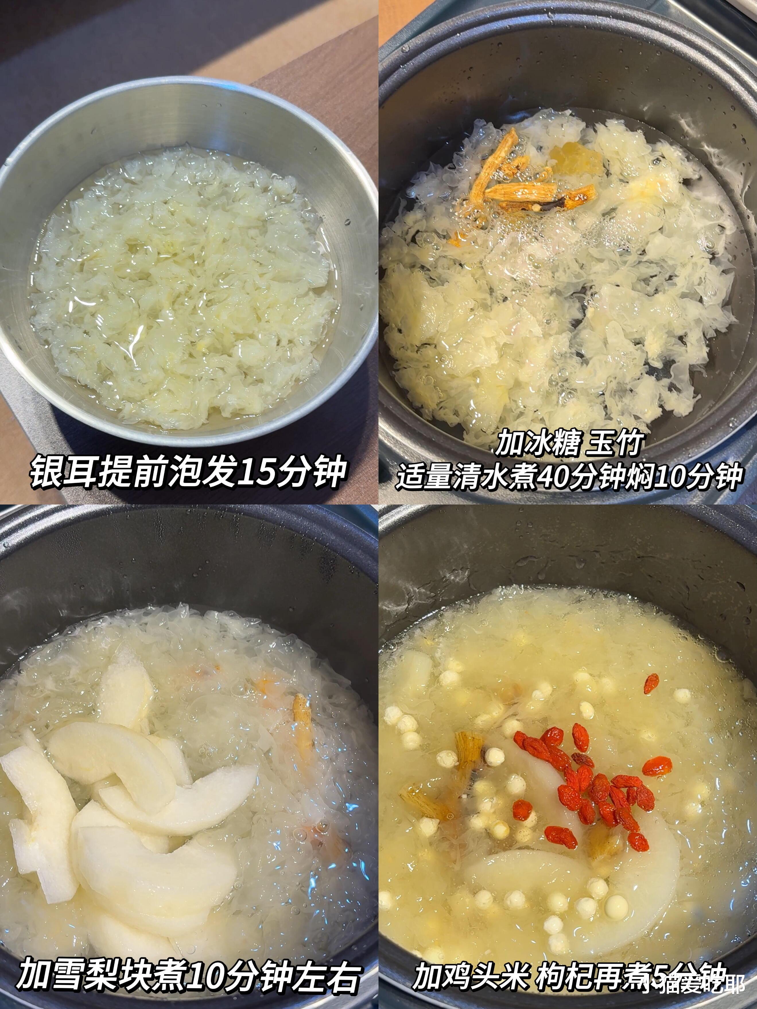 这碗羹的灵感,其实来源于我小时候的记忆。那时候,每到秋冬季节,妈妈总会变着花样给我们做各种滋补的甜品。有一次,她做了这碗羹,我第一口就爱上了。那软糯的鸡头米、清甜的雪梨和顺滑的银耳,搭配在一起,简直是绝配。从那以后,这碗羹就成了我家秋冬必备的美食。