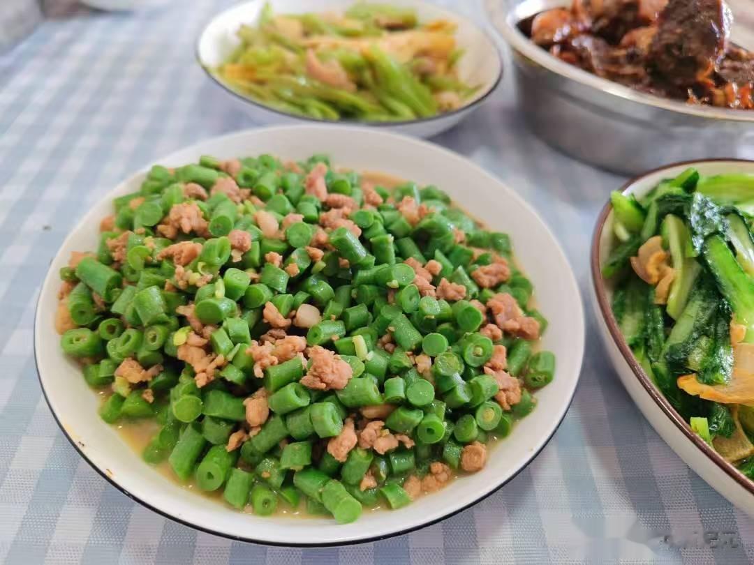 首先是豆角炒肉沫,这是我老爸的下饭拿手菜,孩子特别喜欢吃,老爸经常给孩子们做这个菜肴,做法简单又美味。
