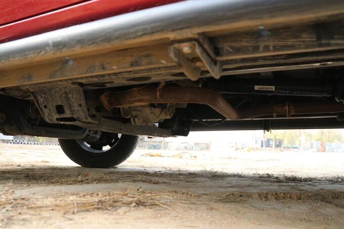 首先在车架结构上,江淮悍途采用“两纵九横”设计,目前市面上在售的大多数皮卡都是八根横梁,更多的横梁也就保证了江淮悍途在山地等复杂路况下具备更强的稳定性和操控信心。除此之外,江淮悍途的横梁采用SPFH590酸洗高强度钢材,纵梁及车身支撑使用SAPH400/440高强结构钢,再加上变截面叠焊设计,使其底盘更加扎实,同时承载能力更强。