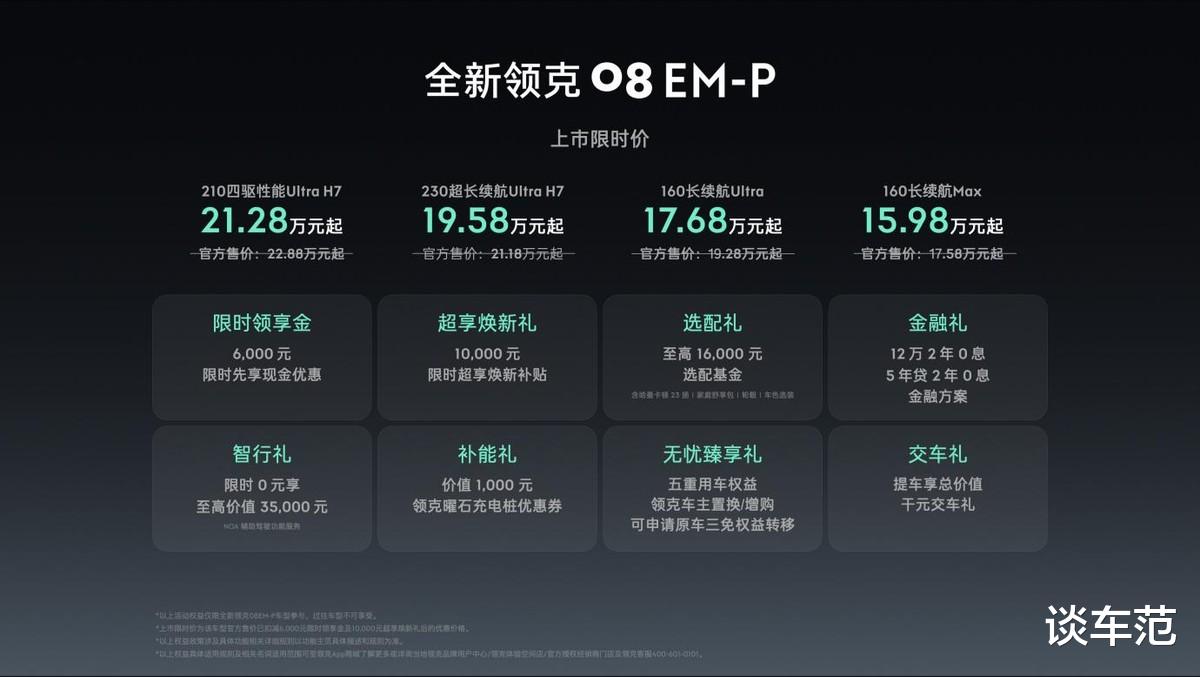 【2025年9月24日 上海】今日,“家庭豪华智混SUV”全新领克08 EM-P正式上市。新车提供160长续航Max、160长续航Ultra、230超长续航Ultra H7、210四驱性能Ultra H7四款车型可选,官方限时价15.98万元-21.28万元。同时,伴随新车上市还有限时领享金、超享焕新礼、选配礼、金融礼、智行礼、补能礼、无忧臻享礼、交车礼在内的8重限时福利。