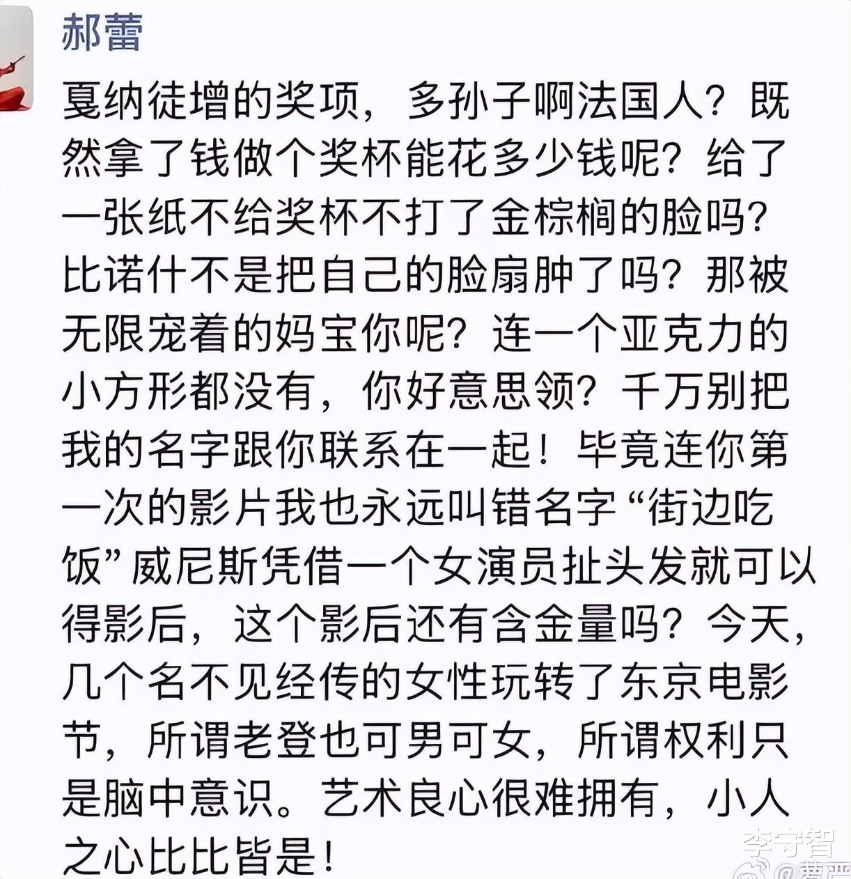本以为沸沸扬扬舆论风波发酵该结束了,谁知道趁着这个风口,娱乐圈霸气资深也很毒舌的郝蕾,朋友圈小作文更是点燃娱乐圈八卦。短短几句话,把这次东京电影节几个演员说得名不见经传,白百何等都被圈进去了。还直接吐槽毕赣导演,以及才拿了威尼斯影后的辛芷蕾。不愧是娱乐圈资深演员加虎女人设,开撕毕白百何还简单直接粗暴。
