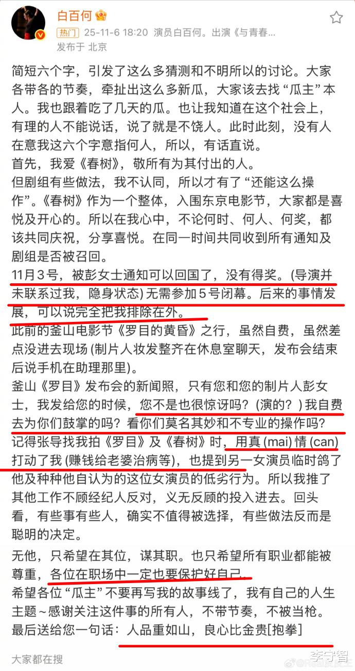 先是白百何与《春树》剧组的恩怨,在东京电影节获奖及安排情况,让双方矛盾加深。开始白百何还只是含沙射影,战火被引向王传君,谁知道内幕是白百何不满意导演和制片人等剧组人员的种种行径,一纸小作文道出前因后果,把双方恩怨曝光。然后这部电影虽然拿奖了,但是却被推到舆论风口浪尖,不知道后面还怎么合作宣发上映。