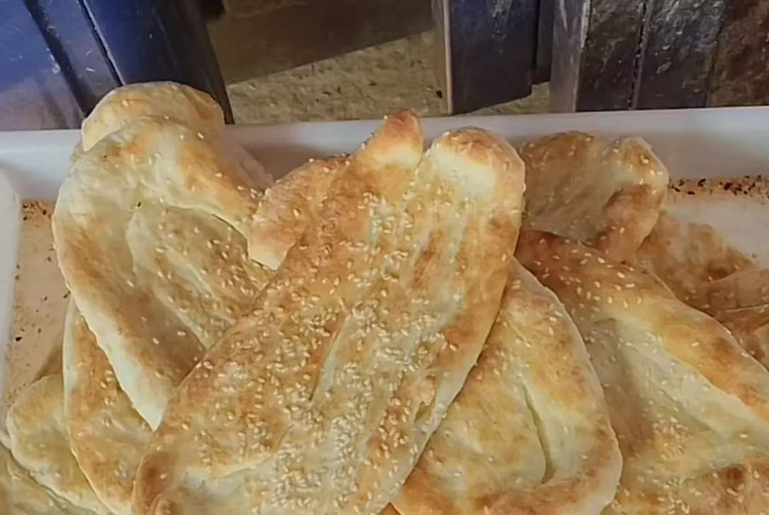 烤牌是当地的一种面食,大概长这个样子,外观金黄,看起来非常酥脆,表面再撒一点炒熟的白芝麻,在当地很受欢迎。
