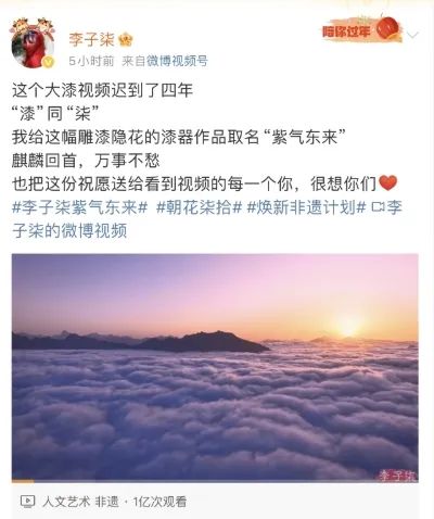 11月12日,李子柒带着新视频《雕漆隐花,雕出紫气东来》同步全网各平台,包括海外平台。